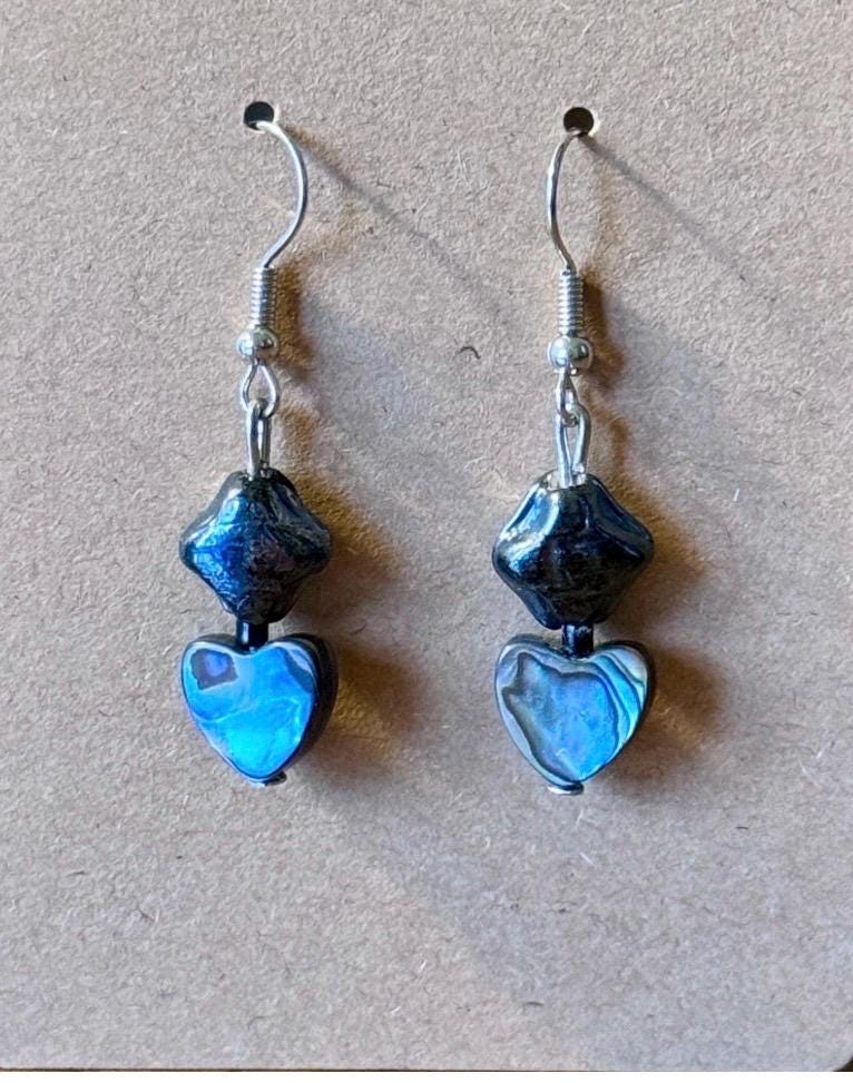 Infuse a touch of whimsy and ocean-inspired beauty into your style with these stunning handcrafted dangle earrings. Featuring iridescent blue heart shaped abalone shell beads and dark blue faceted beads, each pair is unique and eye-catching.