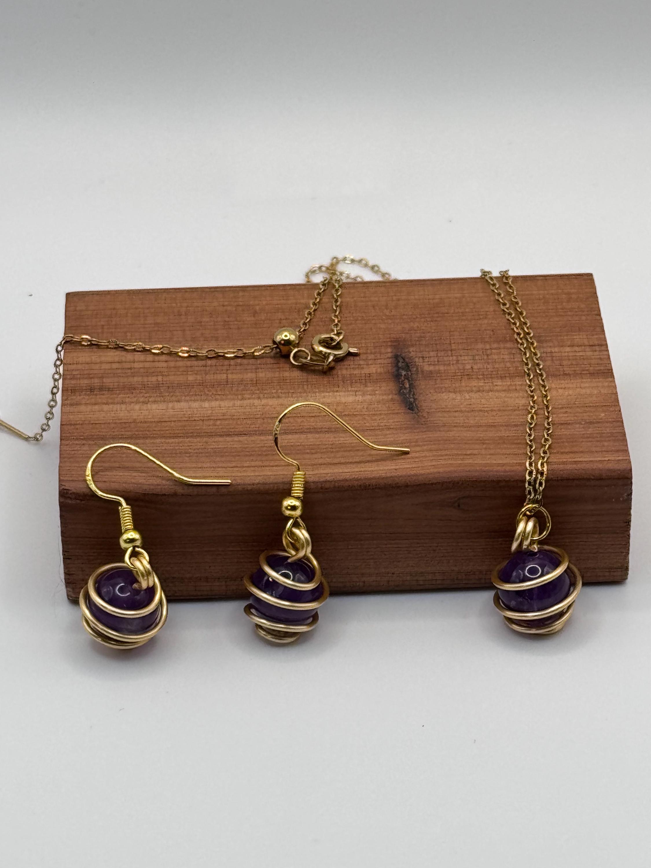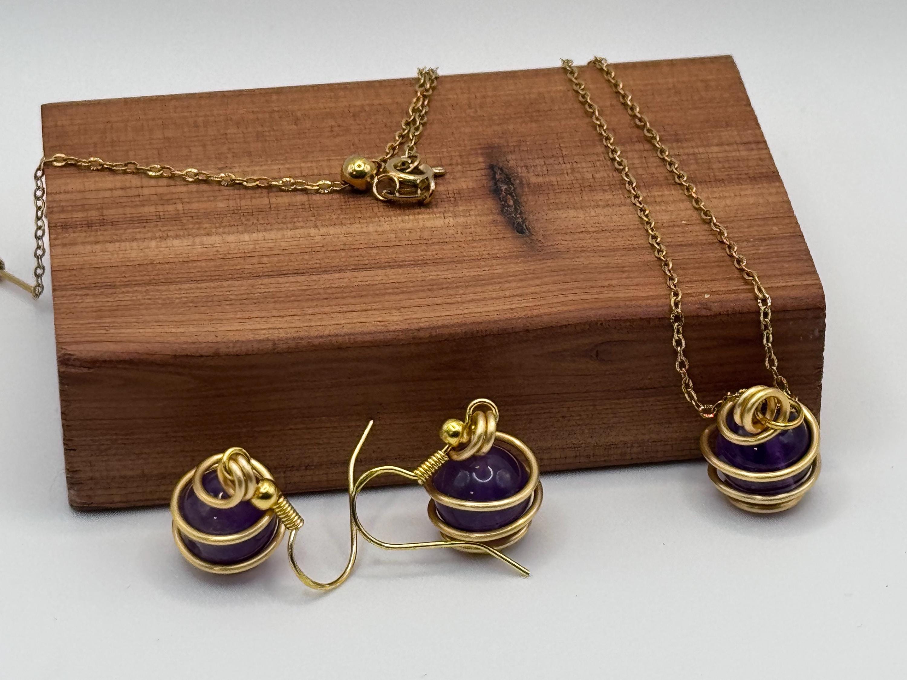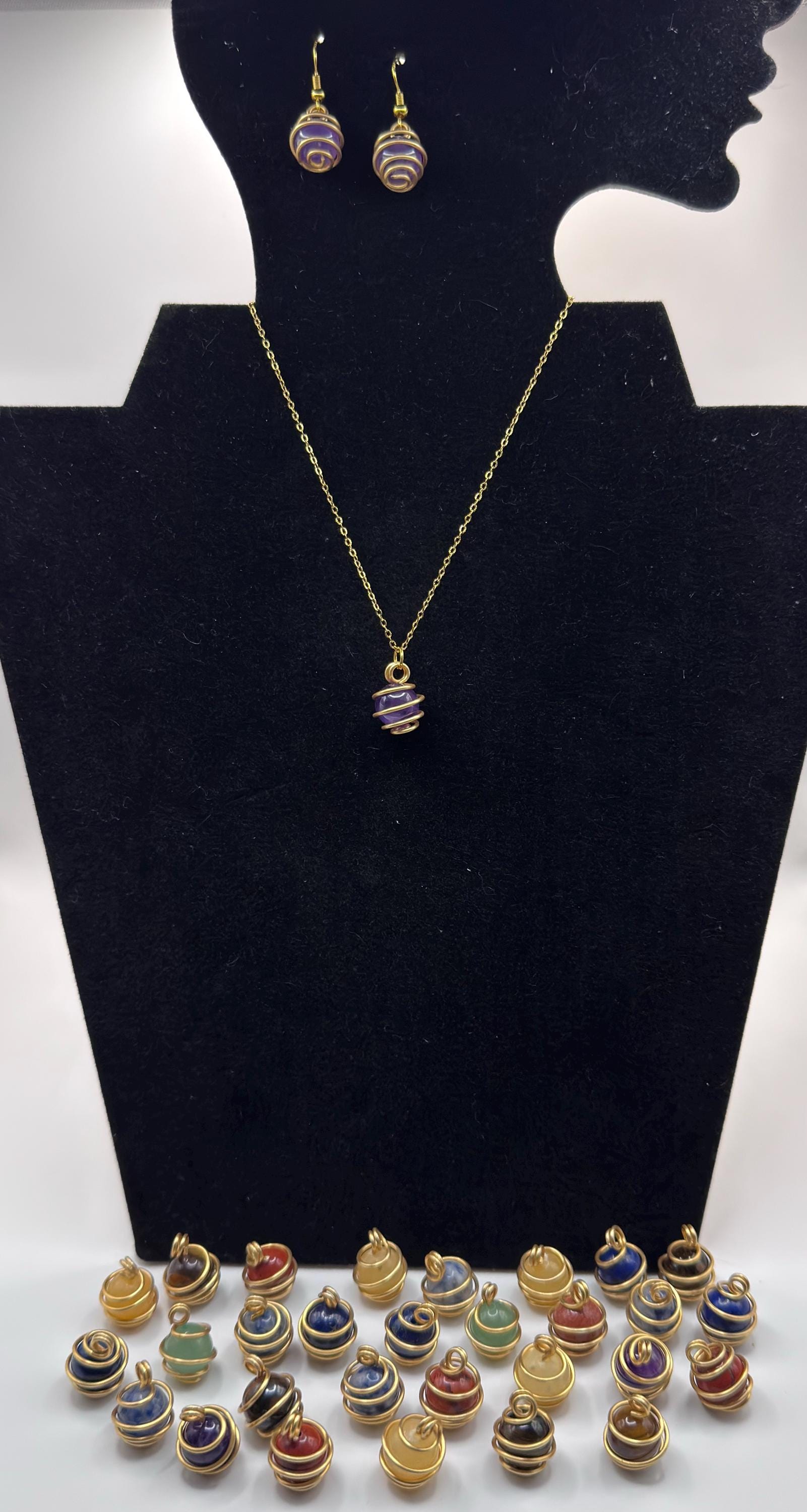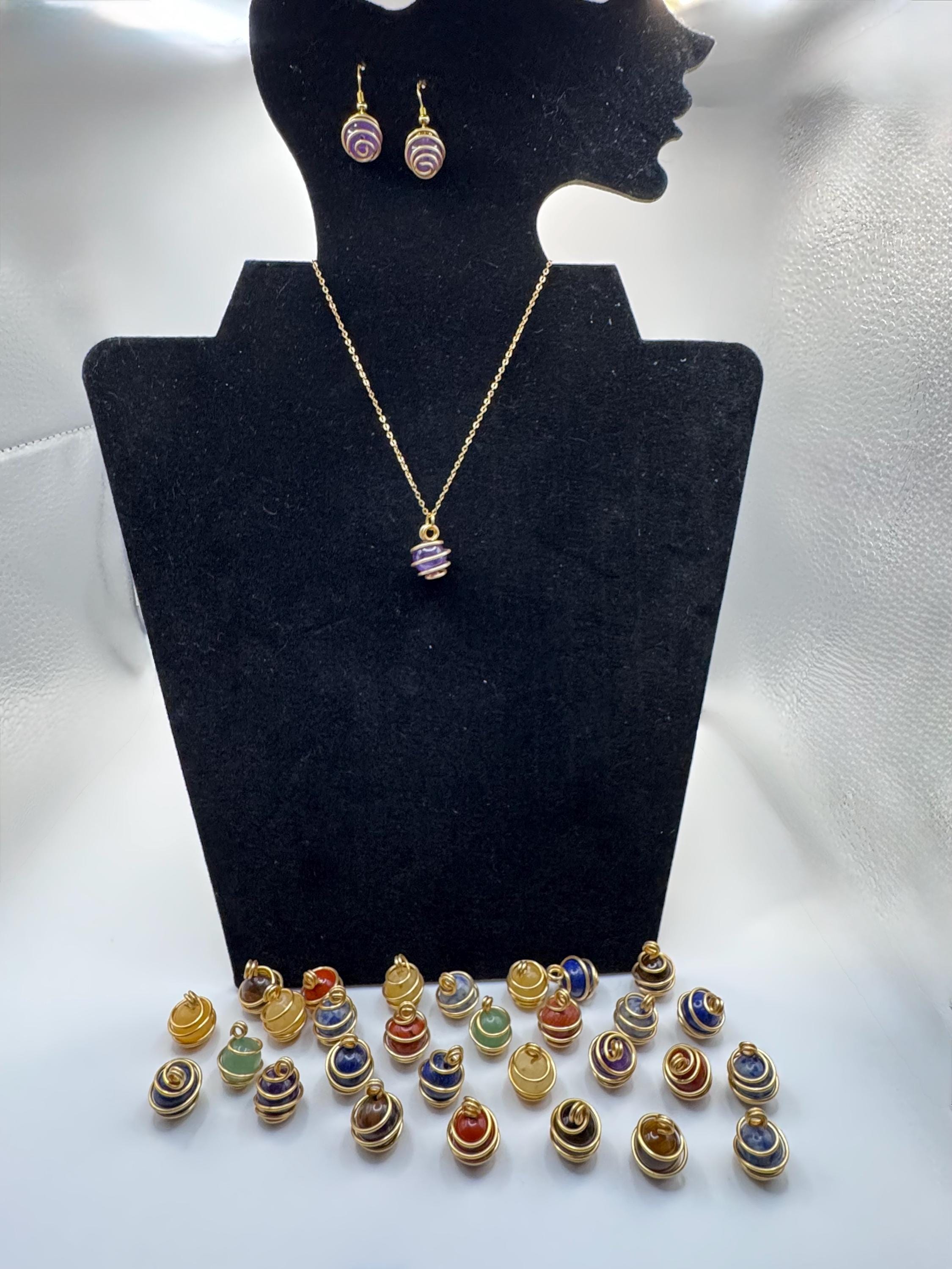 Caged Tumbled Natural Stone Necklace and Earring Set. Both the necklace pendant and earrings showcase small natural, round tumbled stone beads with gold non-tarnish wire wrapped design. This cute set is made with .925 gold plated earwires and an 18K gold plated stainless steel adjustable clavicle chain in a variety of options (make selection from drop down menu).