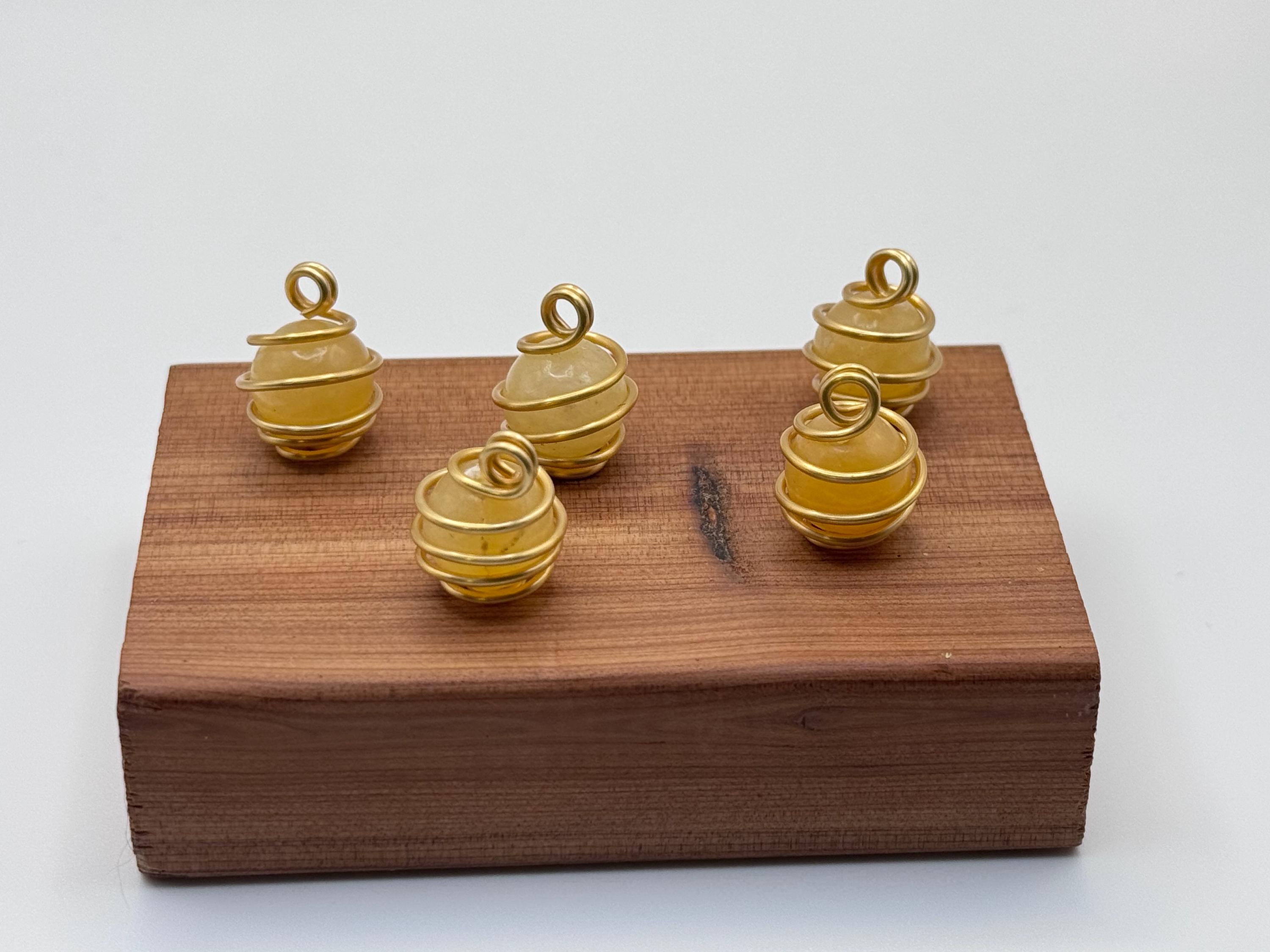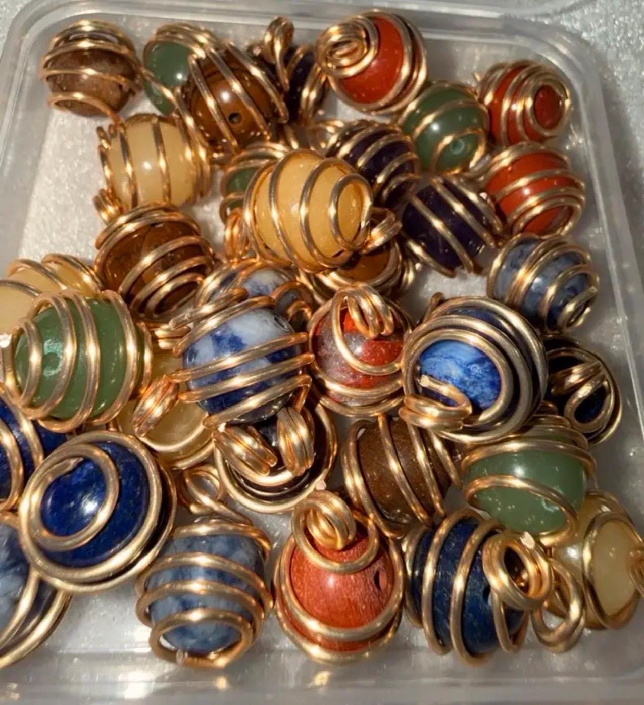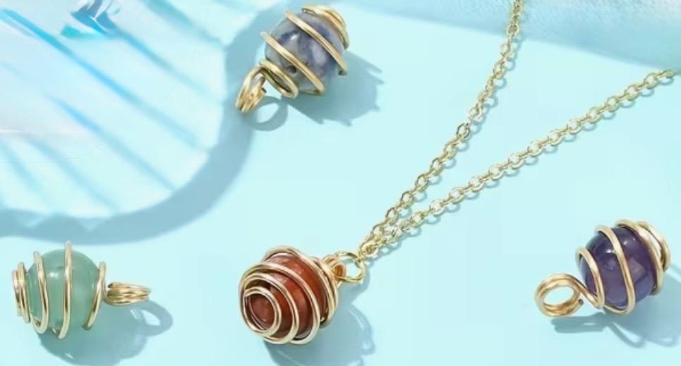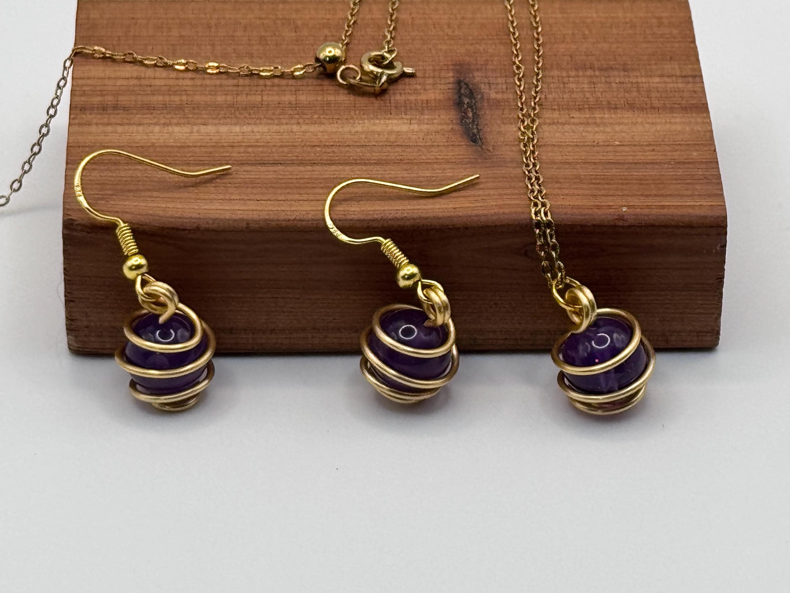 Caged Tumbled Natural Stone Necklace and Earring Set. Both the necklace pendant and earrings showcase small natural, round tumbled stone beads with gold non-tarnish wire wrapped design. This cute set is made with .925 gold plated earwires and an 18K gold plated stainless steel adjustable clavicle chain in a variety of options (make selection from drop down menu).