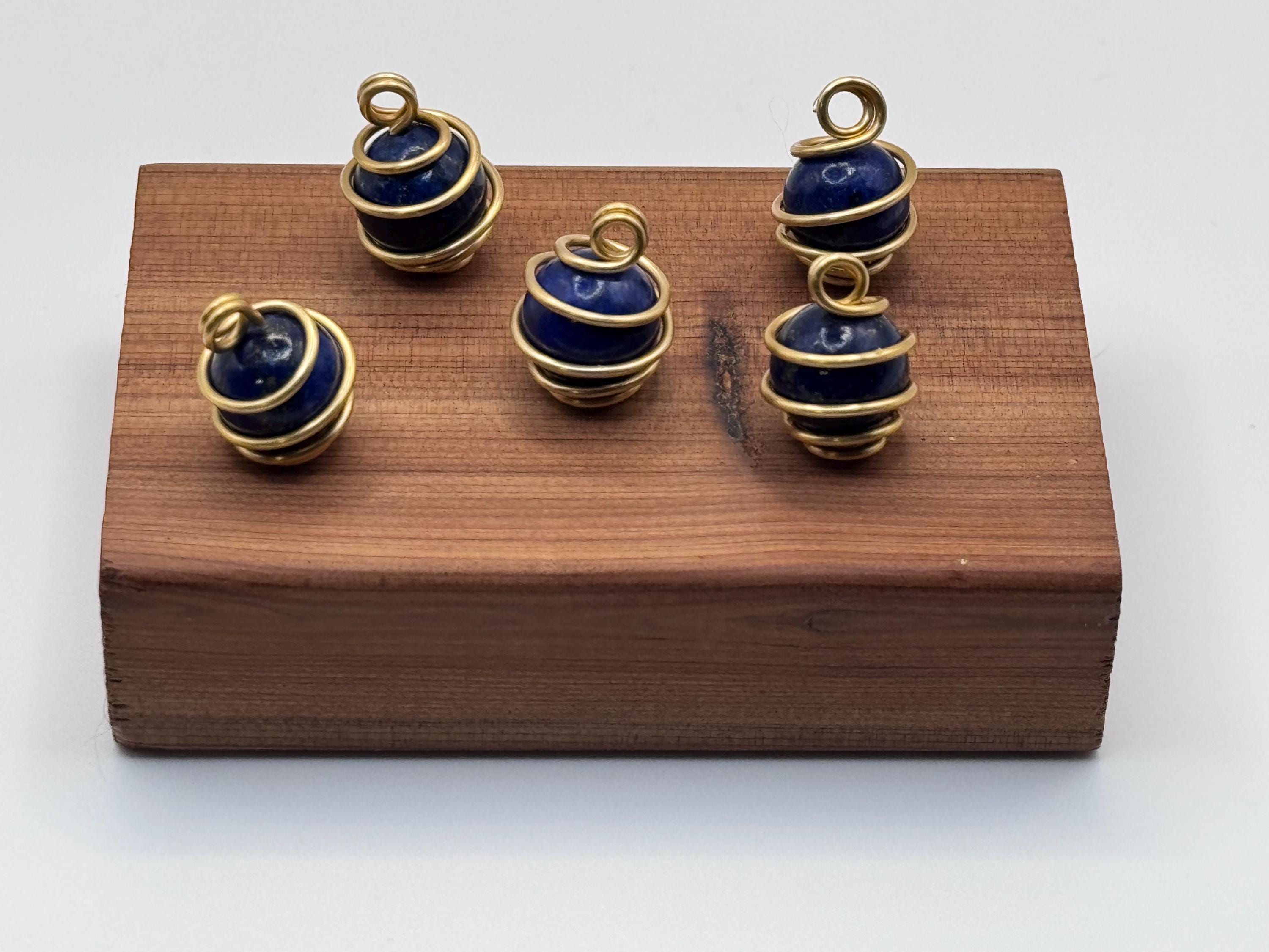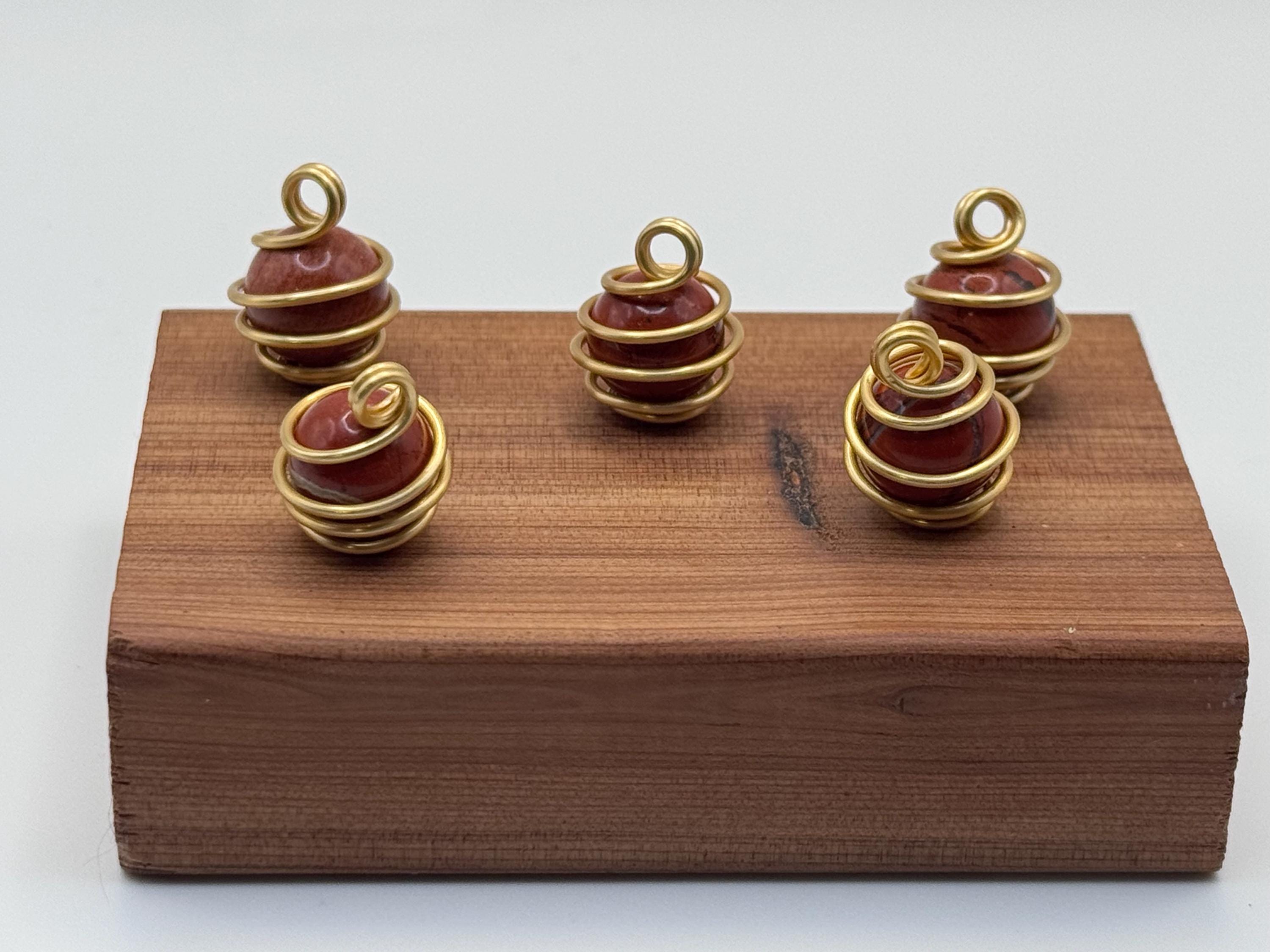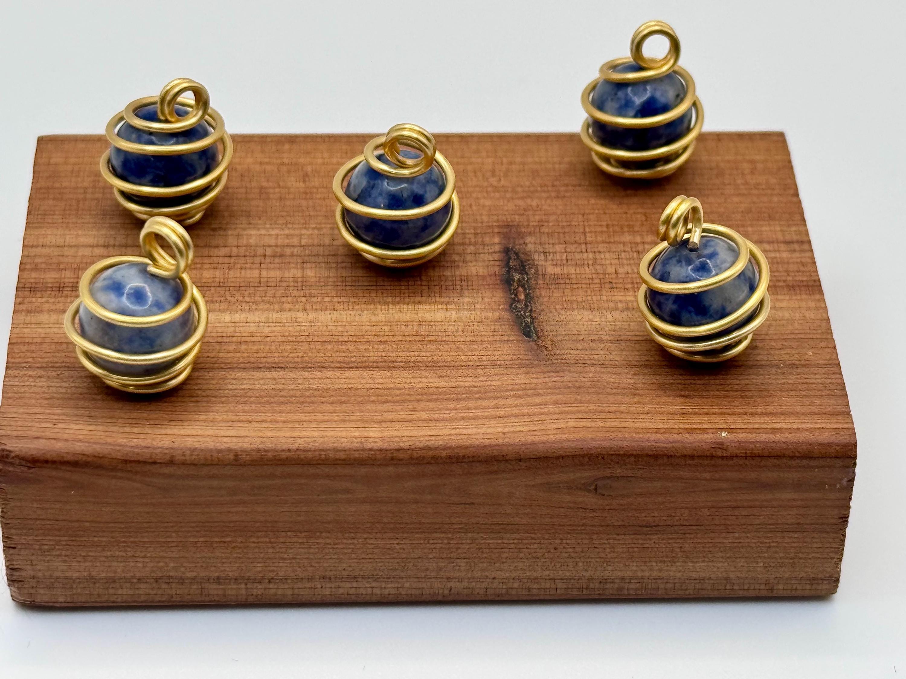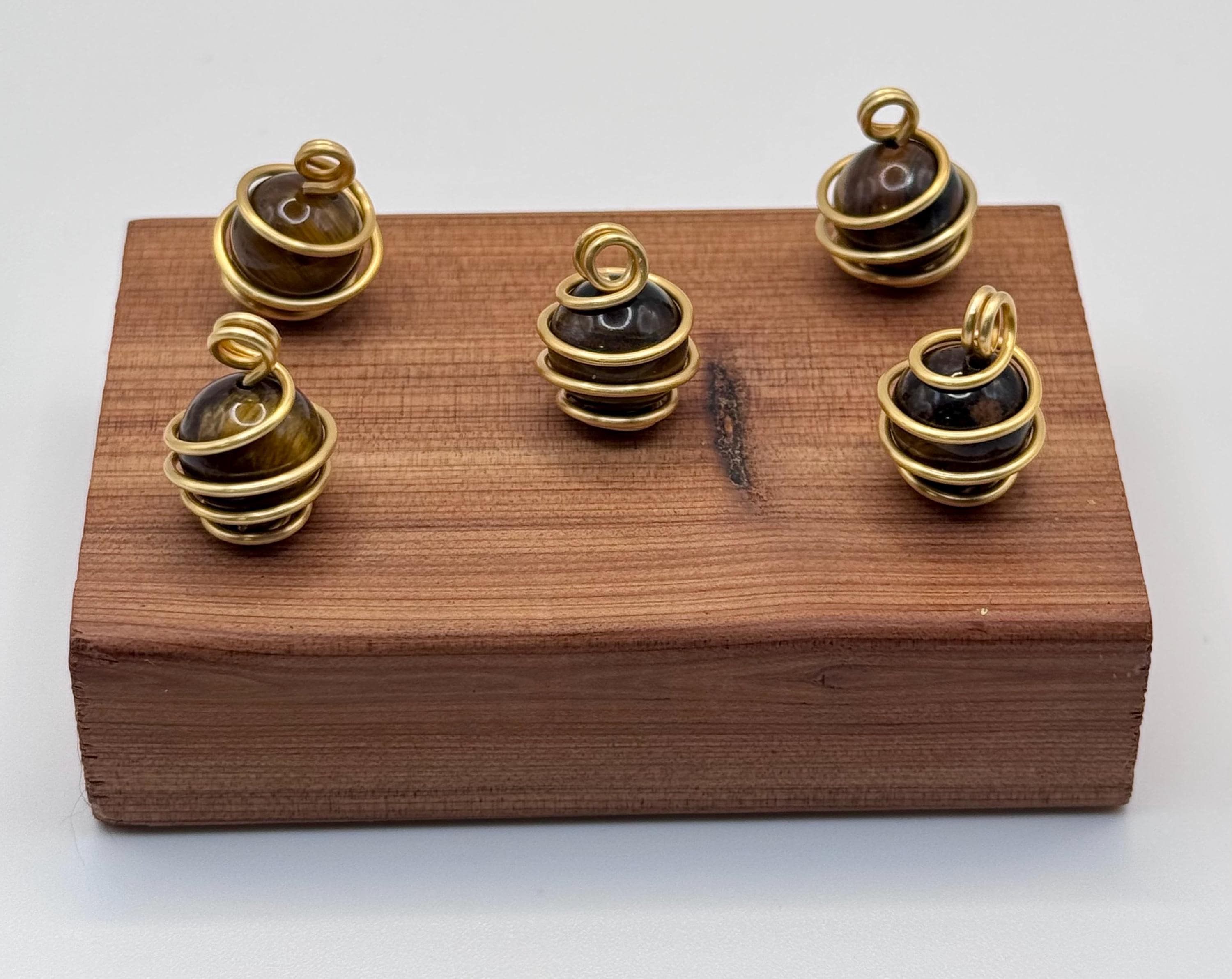 Caged Tumbled Natural Stone Necklace and Earring Set. Both the necklace pendant and earrings showcase small natural, round tumbled stone beads with gold non-tarnish wire wrapped design. This cute set is made with .925 gold plated earwires and an 18K gold plated stainless steel adjustable clavicle chain in a variety of options (make selection from drop down menu).