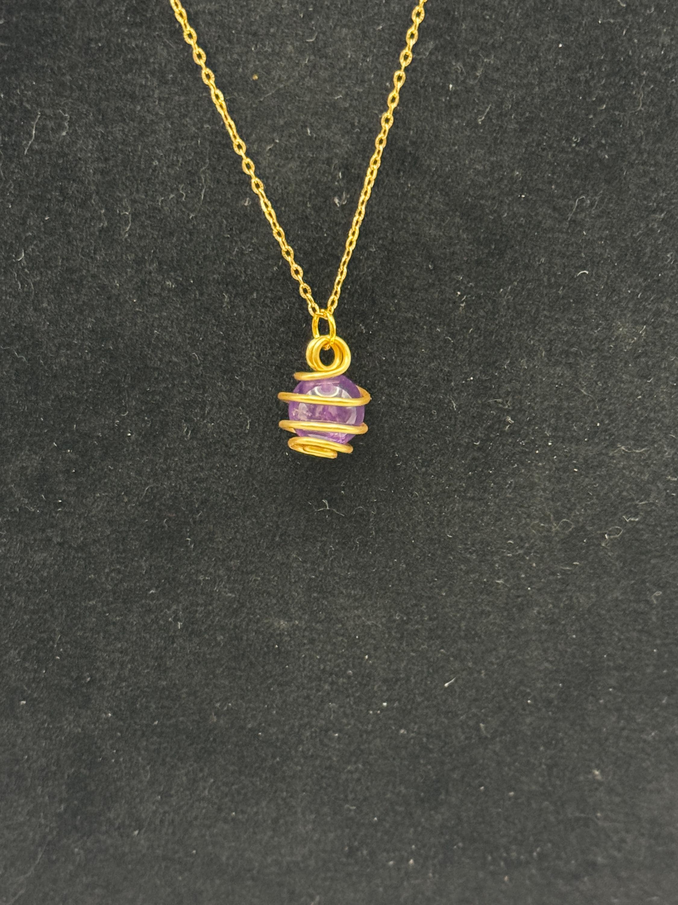 Crystal Caged Tumbled Amethyst Stone Necklace and Earring Set. Both the necklace pendant and earrings showcase small purple amethyst, round tumbled stone beads with gold non-tarnish wire wrapped design. This cute set is made with .925 gold plated earwires and an 18K gold plated stainless steel 1.2mm * 47cm chain. If you desire a longer chain or an extention added please send a request via email.