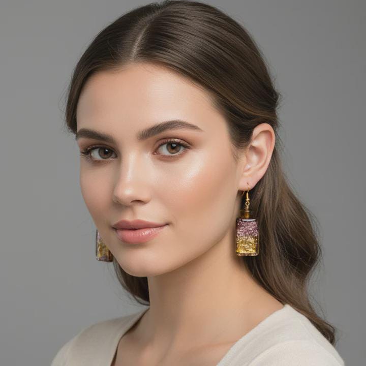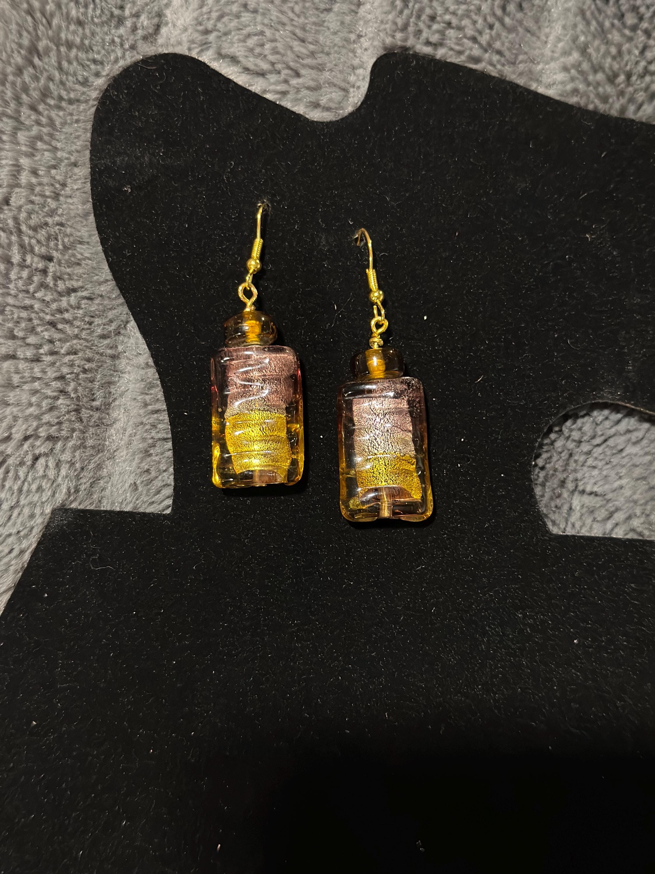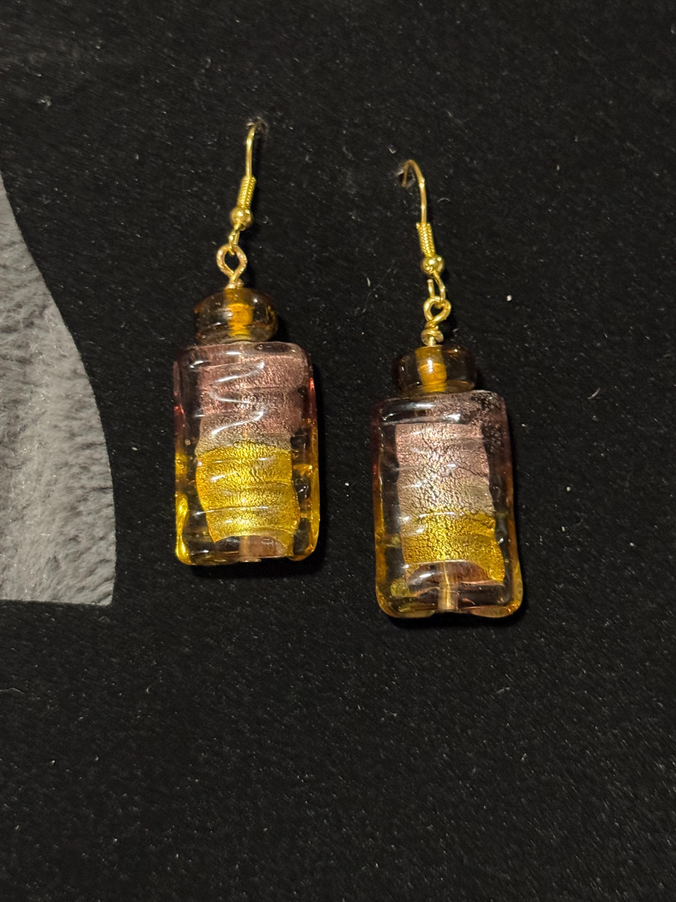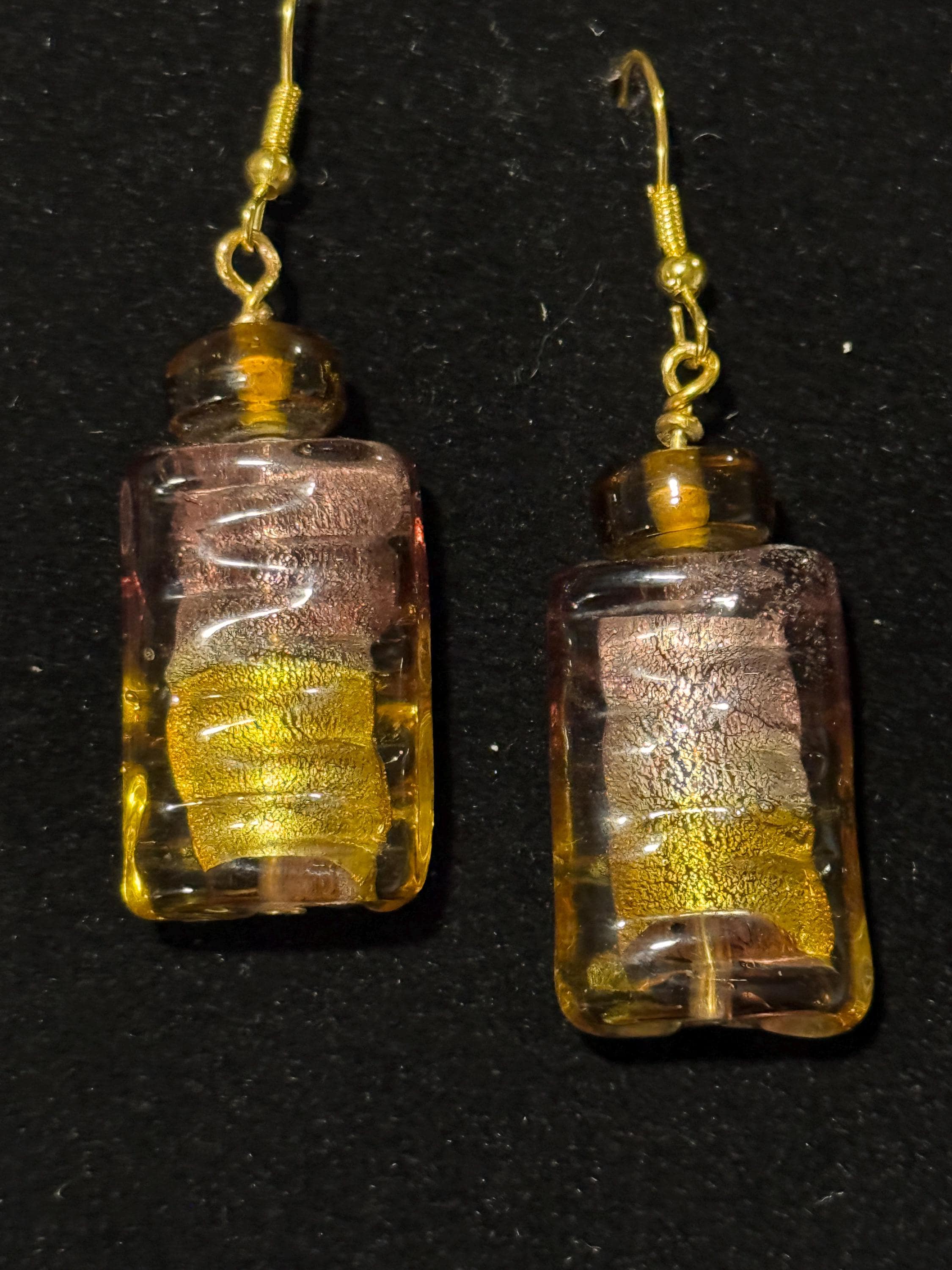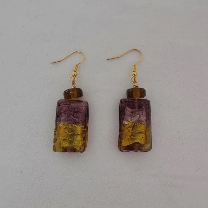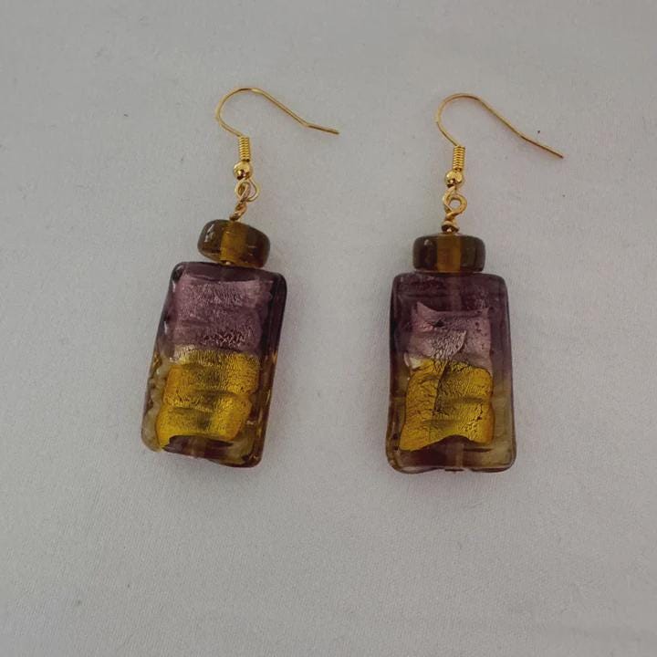 Aura of the past vintage earrings are a timeless treasure. With their dangle style these vintage recycled pieces add a touch of timeless style to any look. Perfect for those who love unique and sustainable accessories. Beads: o Two-tone blended purple and amber rectangular shaped with a rigid texture glass bead o amber colored rondelle glass bead Metal Components: o Gold-toned head pin o Gold-tones ear wire Measurements: o ¾” gold-toned ear wires o Accent 1 ½”x 1 ½ cm