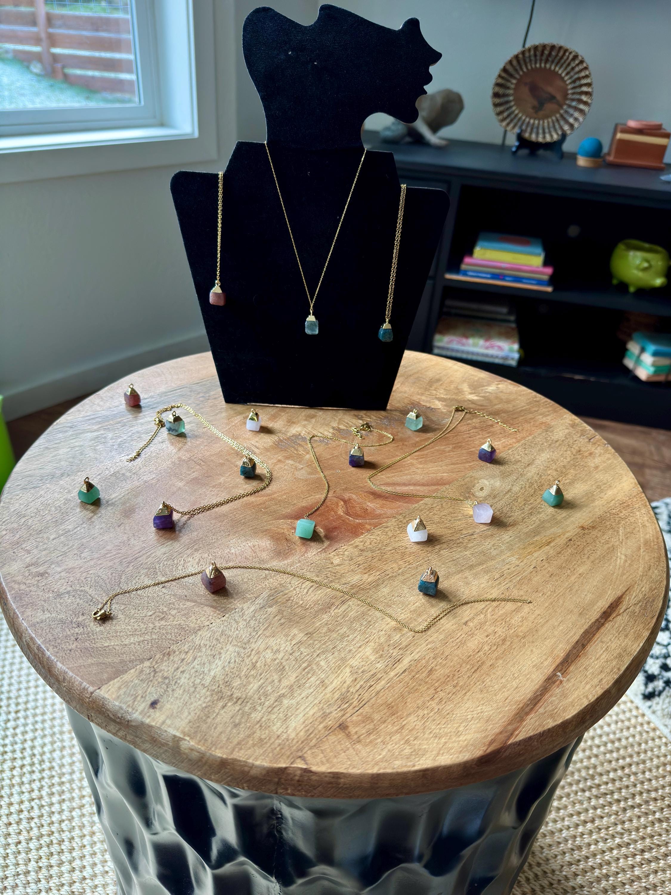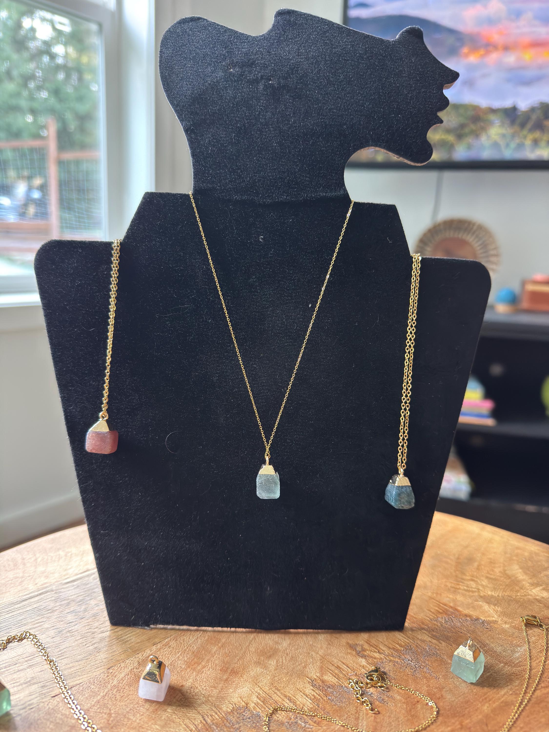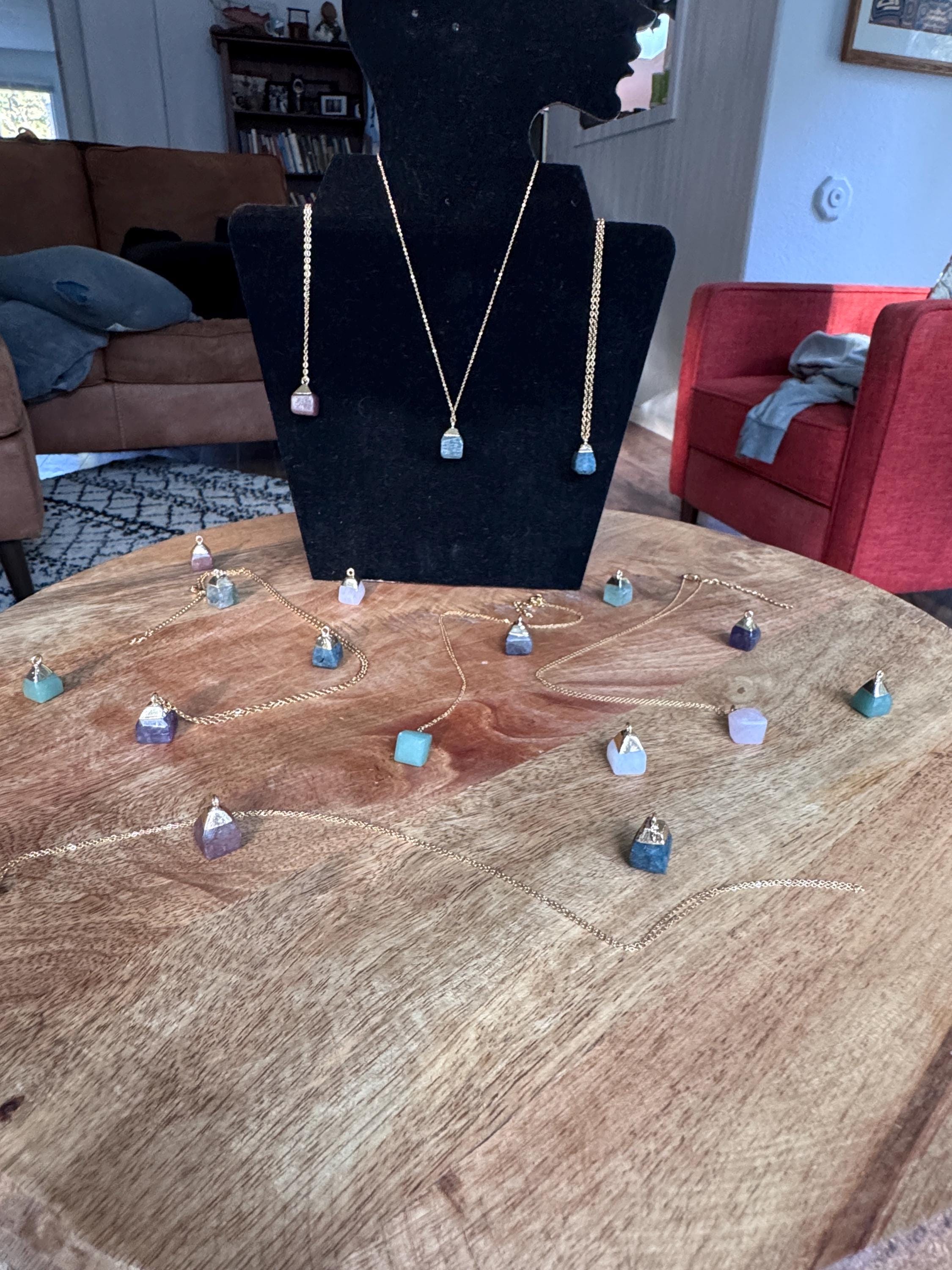 Innovate your style with our stunning collection of natural stone drop pendant necklaces. Each piece features a unique polished gemstone suspended from a delicate high quality gold toned chain. Perfect for adding a touch of organic beauty and a pop of color to any outfit. These necklaces transition seamlessly from casual day wear to elegant evening attire. Our authentic gemstones showcase a variety of natural stones including -