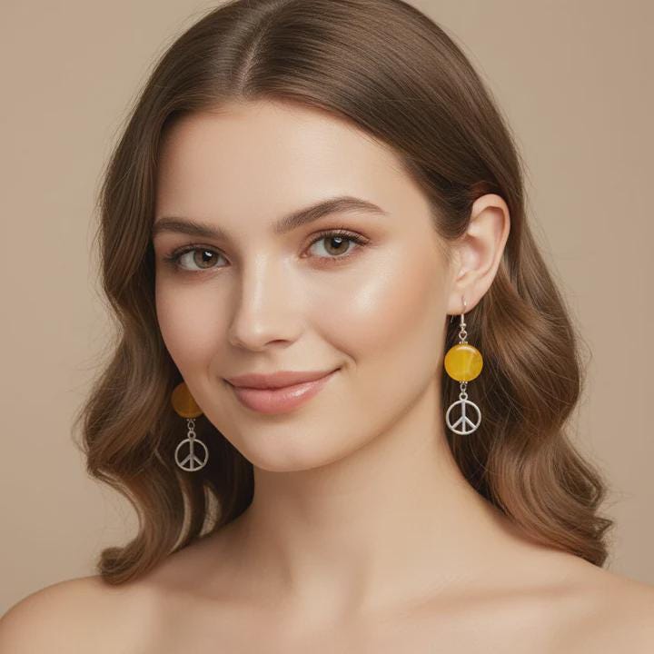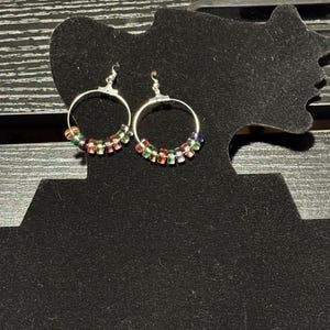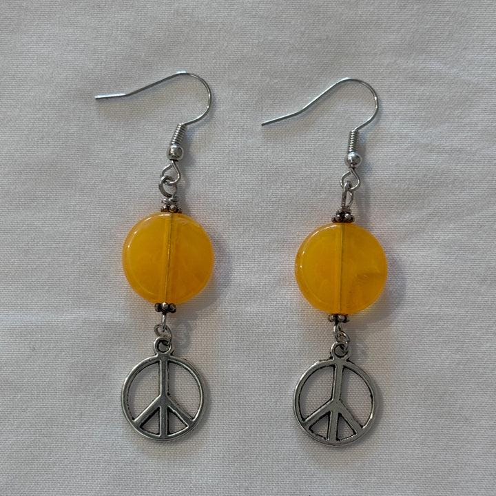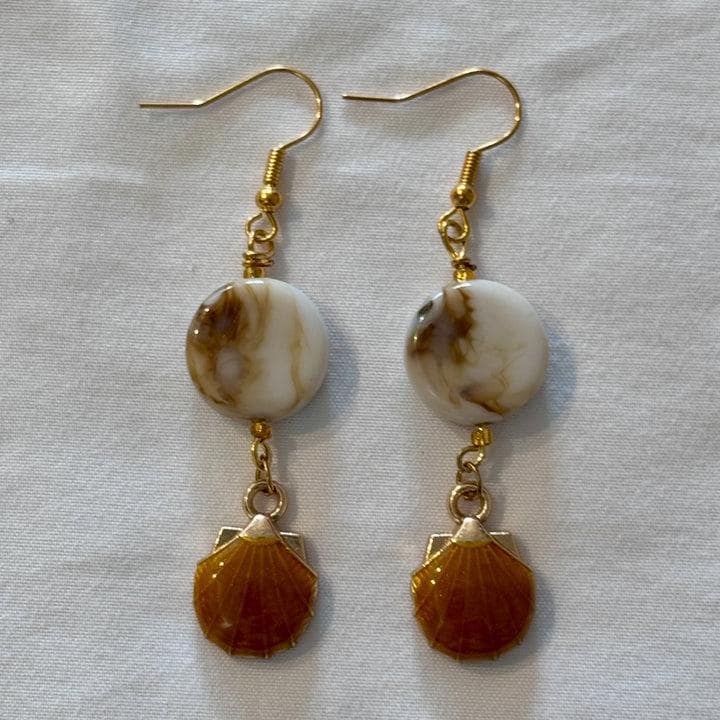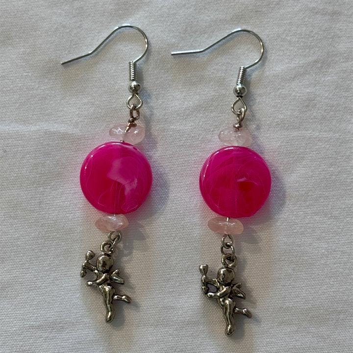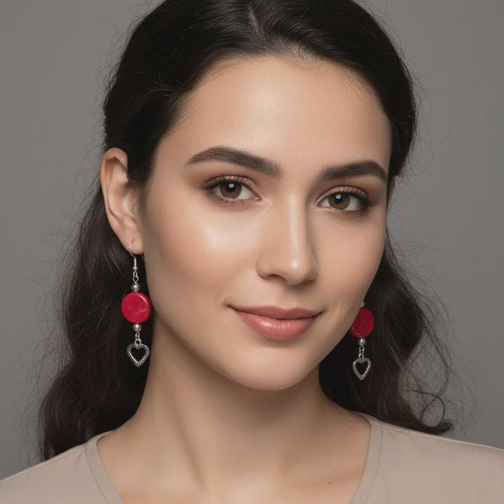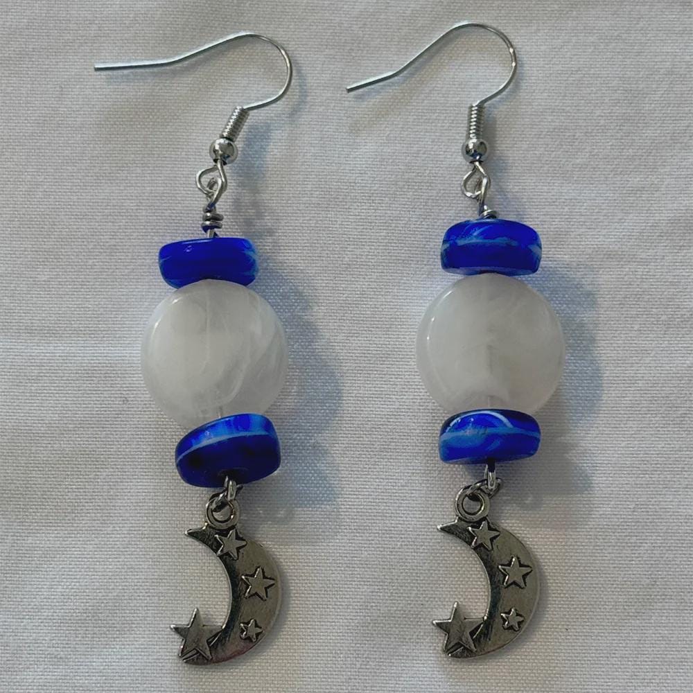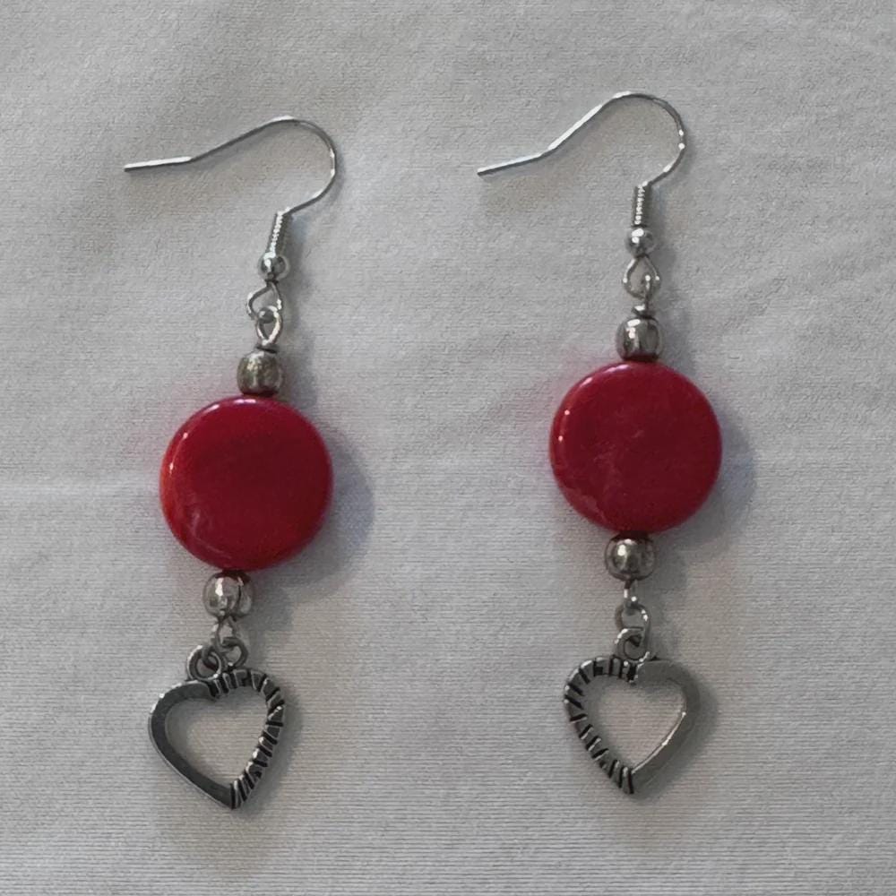 These dangle style charm accent earrings feature an oblate shaped marbled design bead. Their bright color really stands out making a bold and beautiful statement. They are nicely paired with a silver-toned charm.These earrings are bold and will stand out in any crowd. Beads: o 15mm oblate shaped red/white marble acrylic loose spacer bead. o 2 small round silver-toned beads Metal Components: o silver-toned eye pin o silver-toned ear hooks o silver-toned heart charm Measurements: o Accent 1 ¾” x ½” (accept moon & sun charm is 2" long) o ¾” ear wires