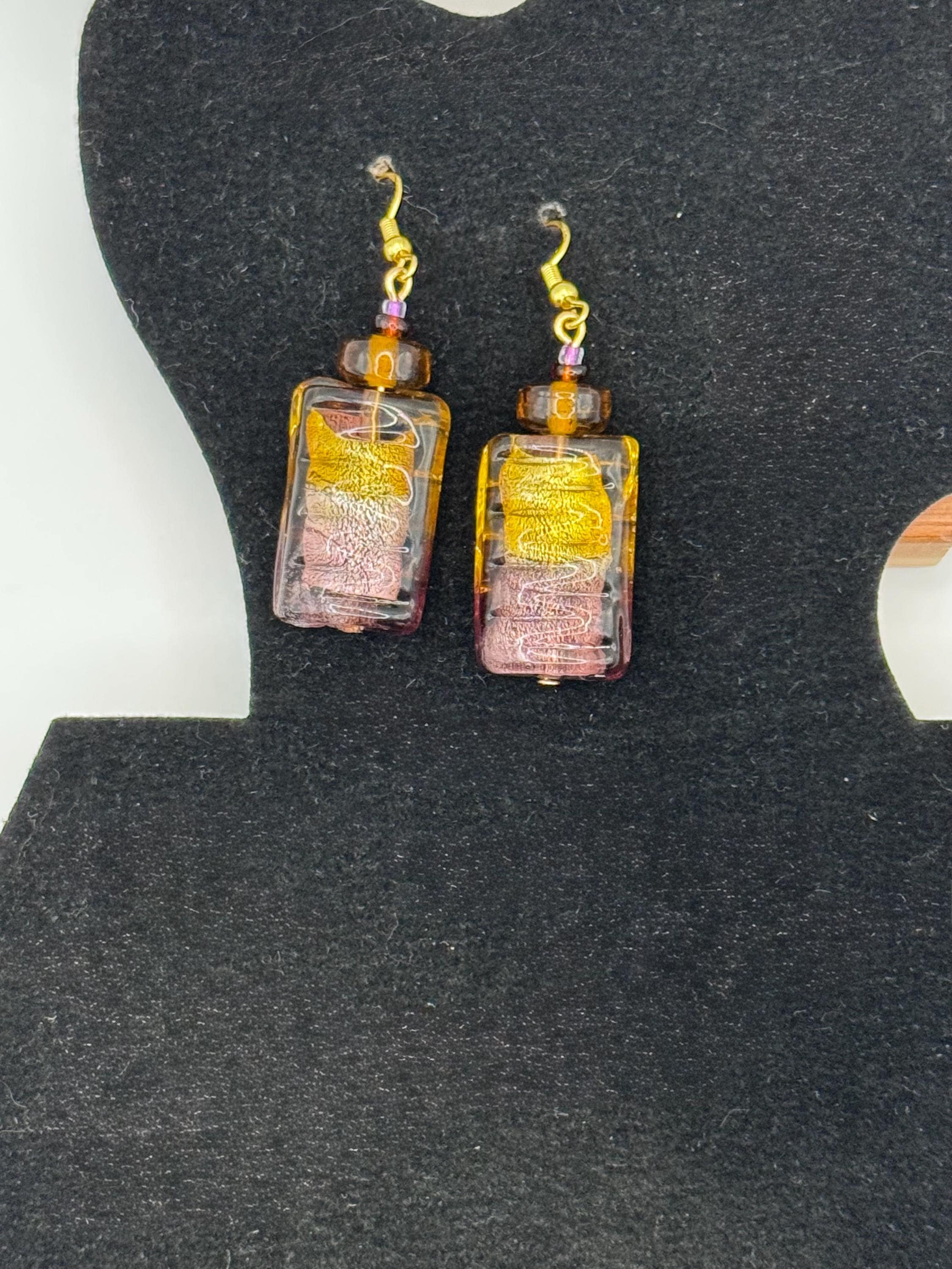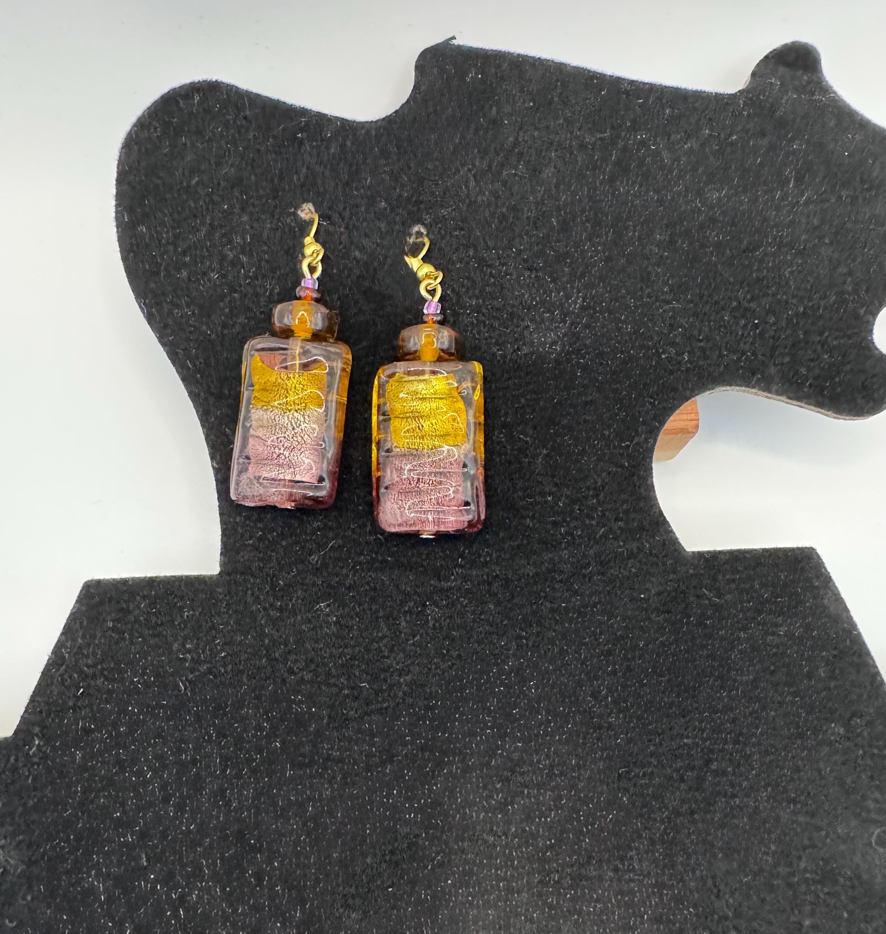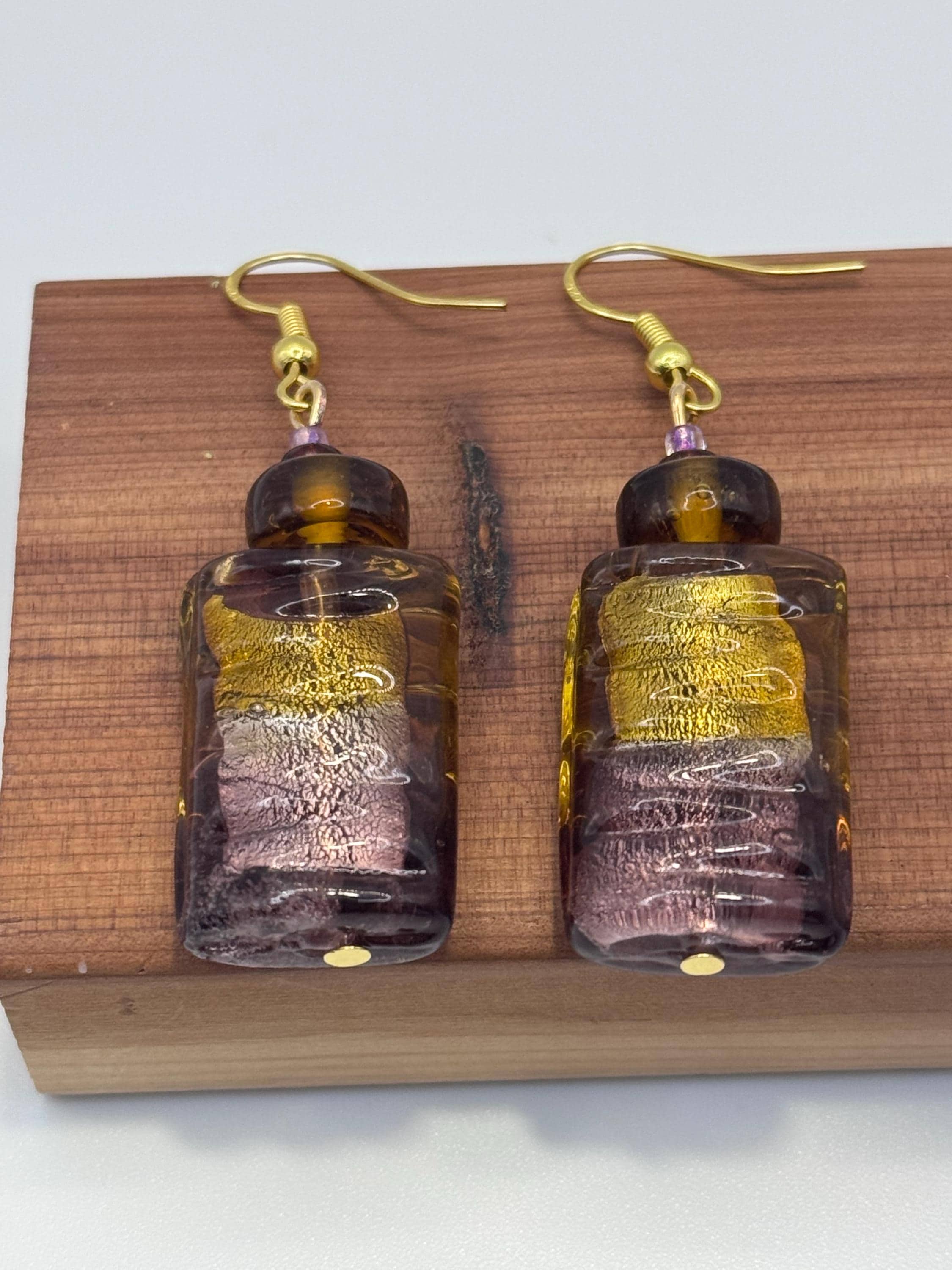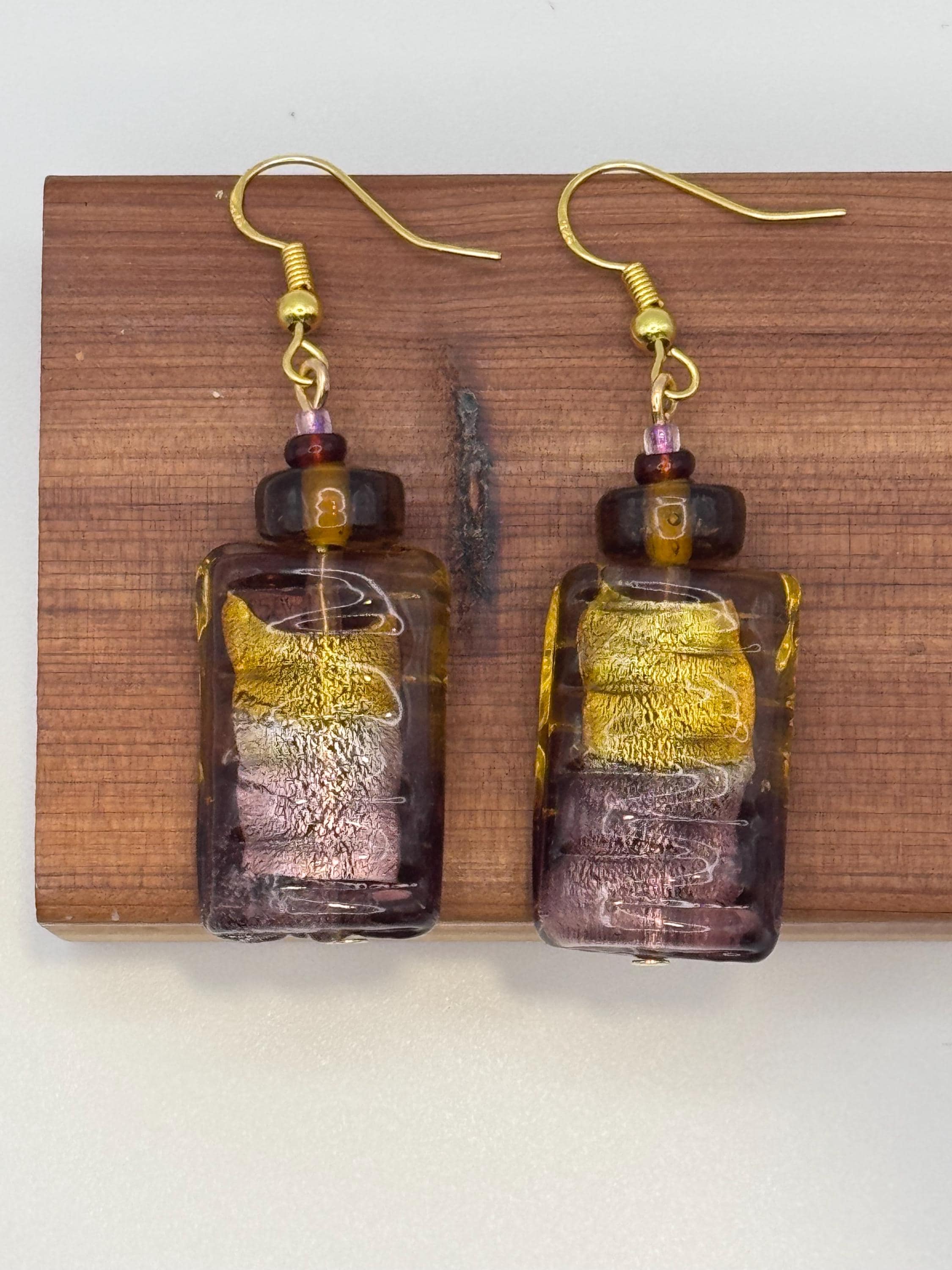 The focal beads are rectangular, ridged glass with a two tone glow: amber at the top, amethyst at the base, and gold foil suspended inside. Their color shift and foil core are classic hallmarks of Venetian lampwork.