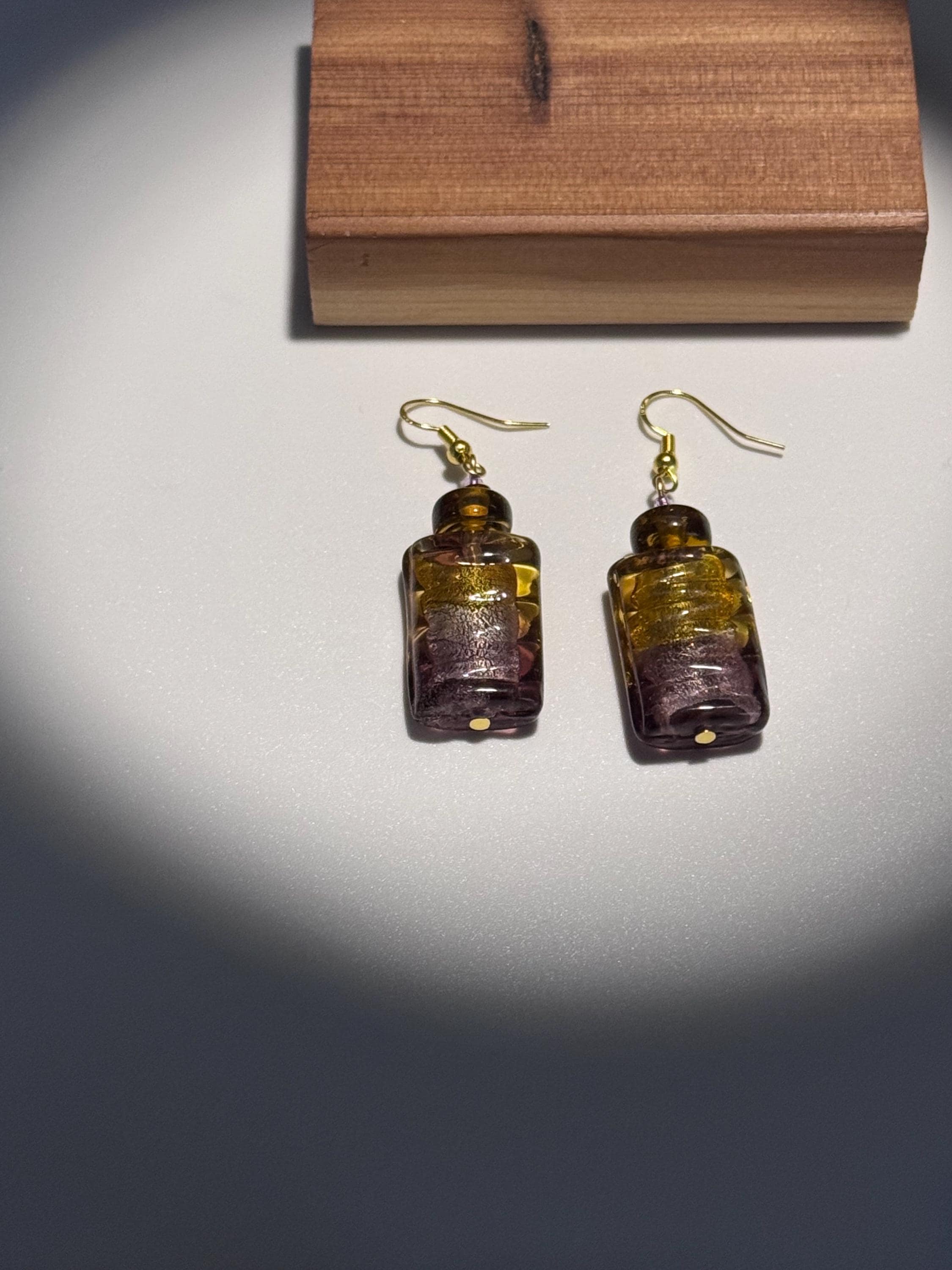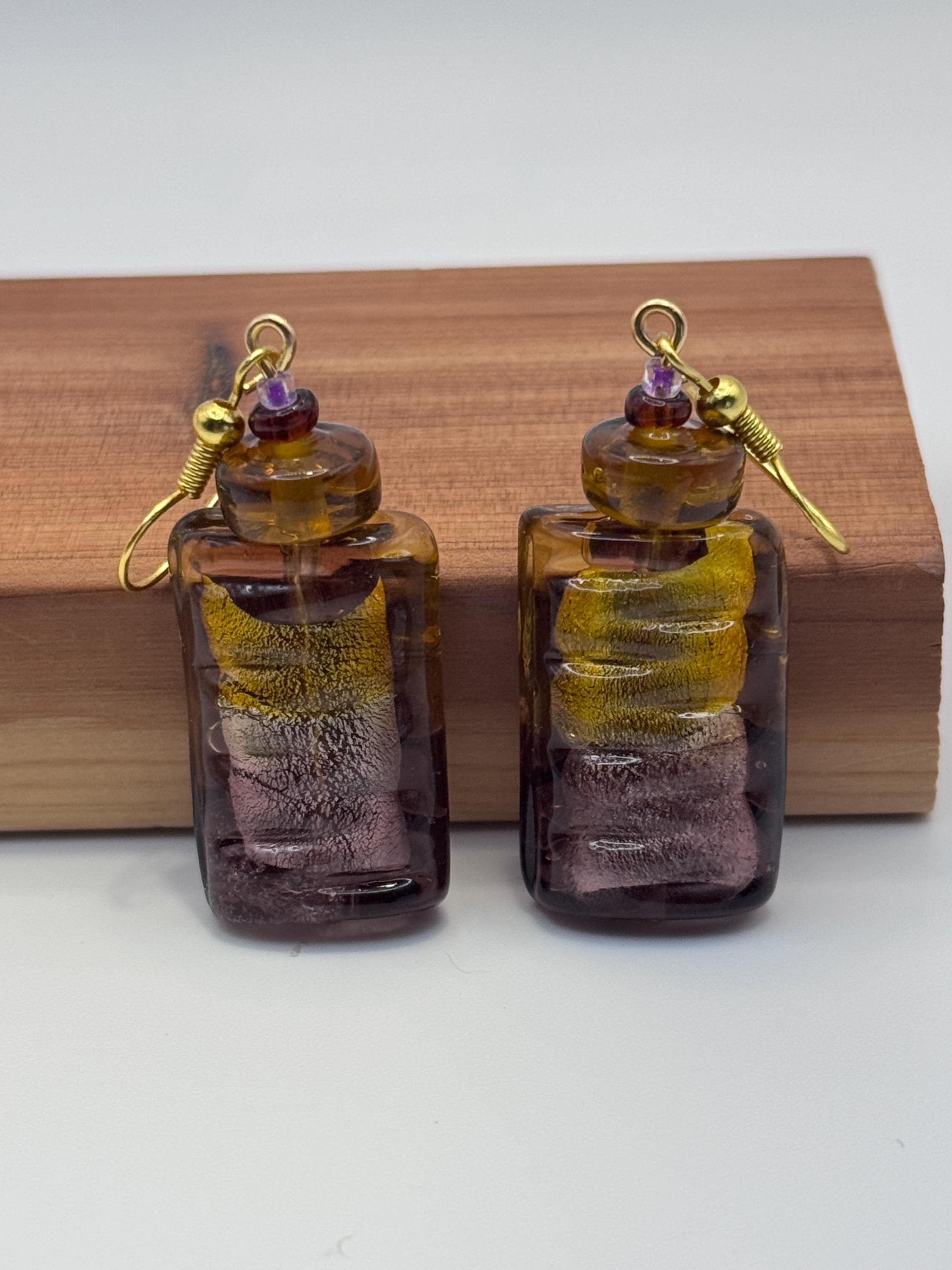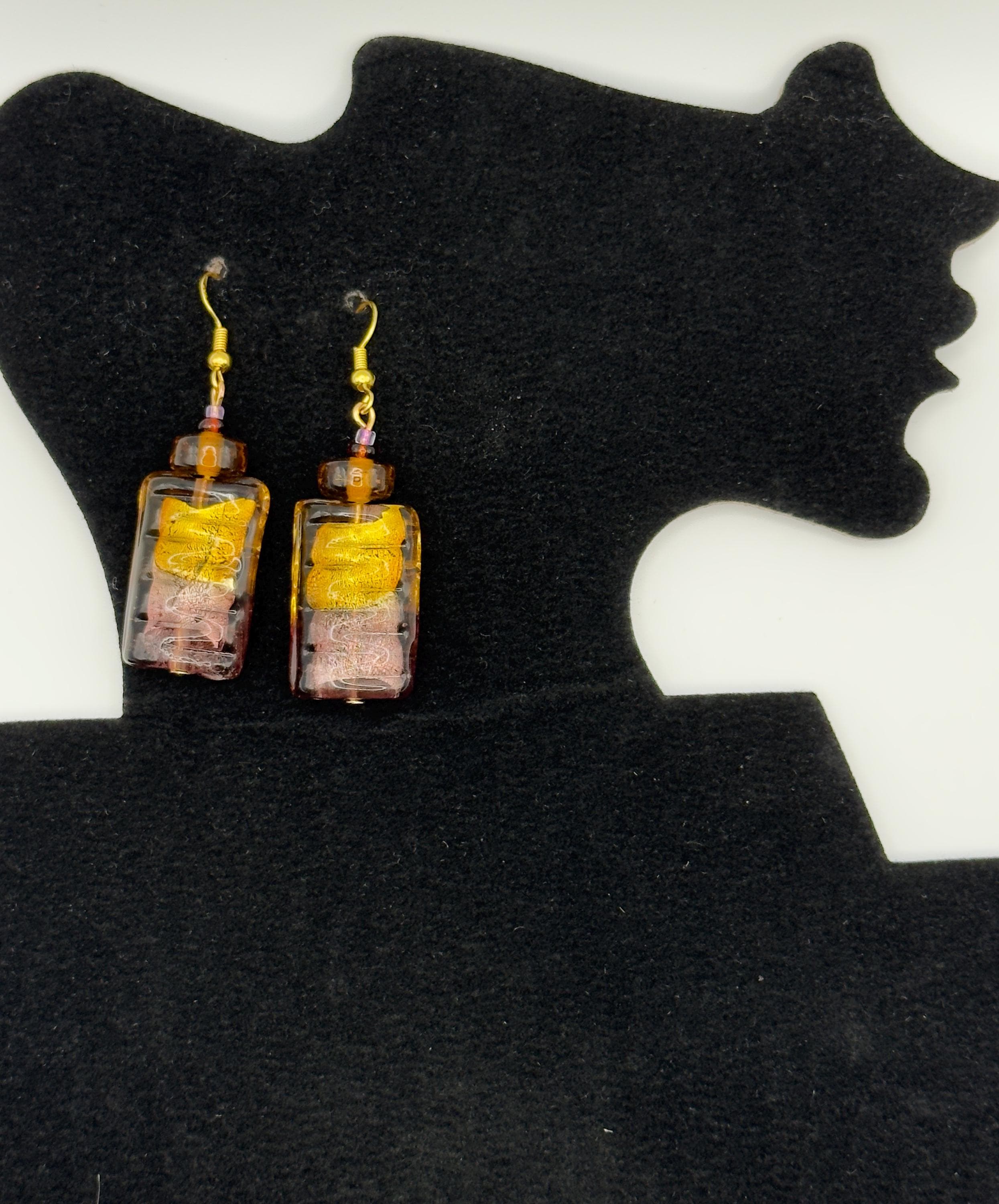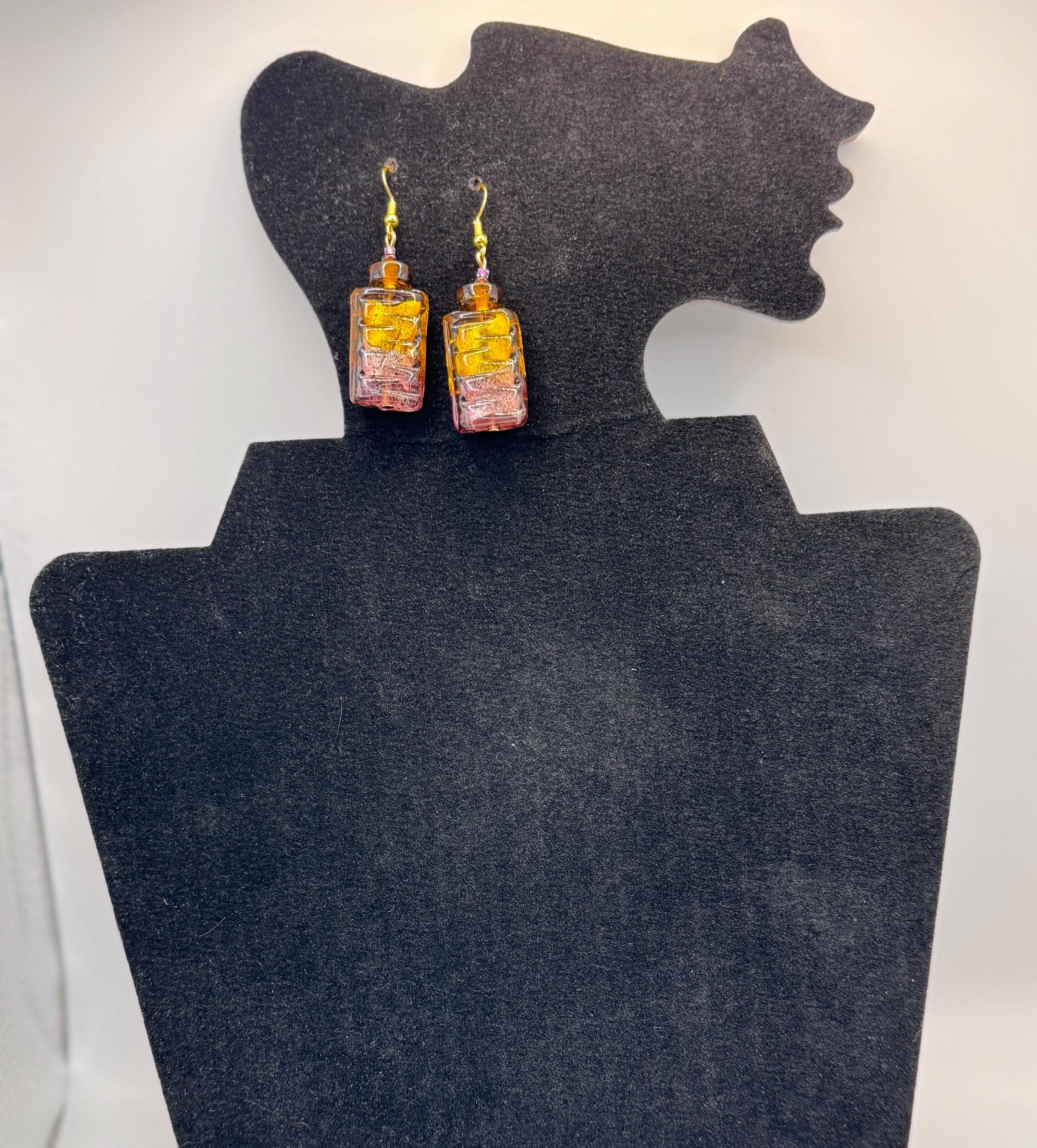 The focal beads are rectangular, ridged glass with a two tone glow: amber at the top, amethyst at the base, and gold foil suspended inside. Their color shift and foil core are classic hallmarks of Venetian lampwork.